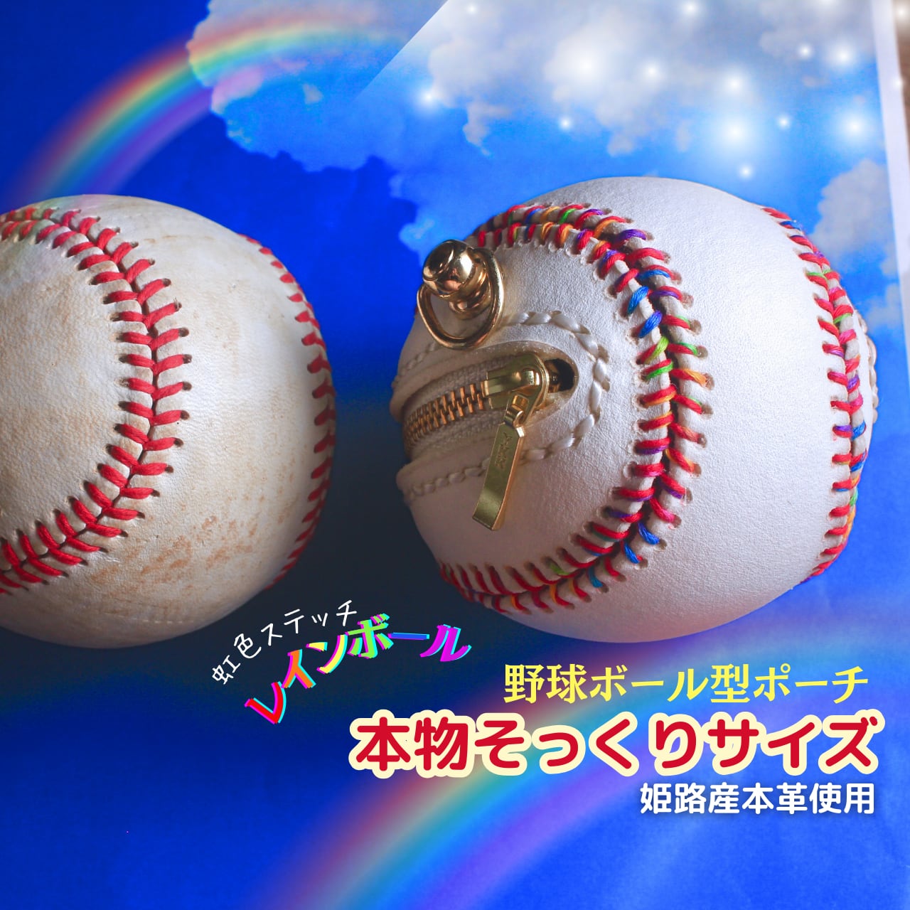 野球ボール 型 ポーチ リアルサイズ【レインボーカラー糸使用 】姫路レザー リアルな野球ボール の鞄のアクセントや 野球好きさんへのプレゼントに!カラビナ付き 送料無料 【刻印オプションあり】baseball | 革小物のオンラインショップ Leather Shop キュイール