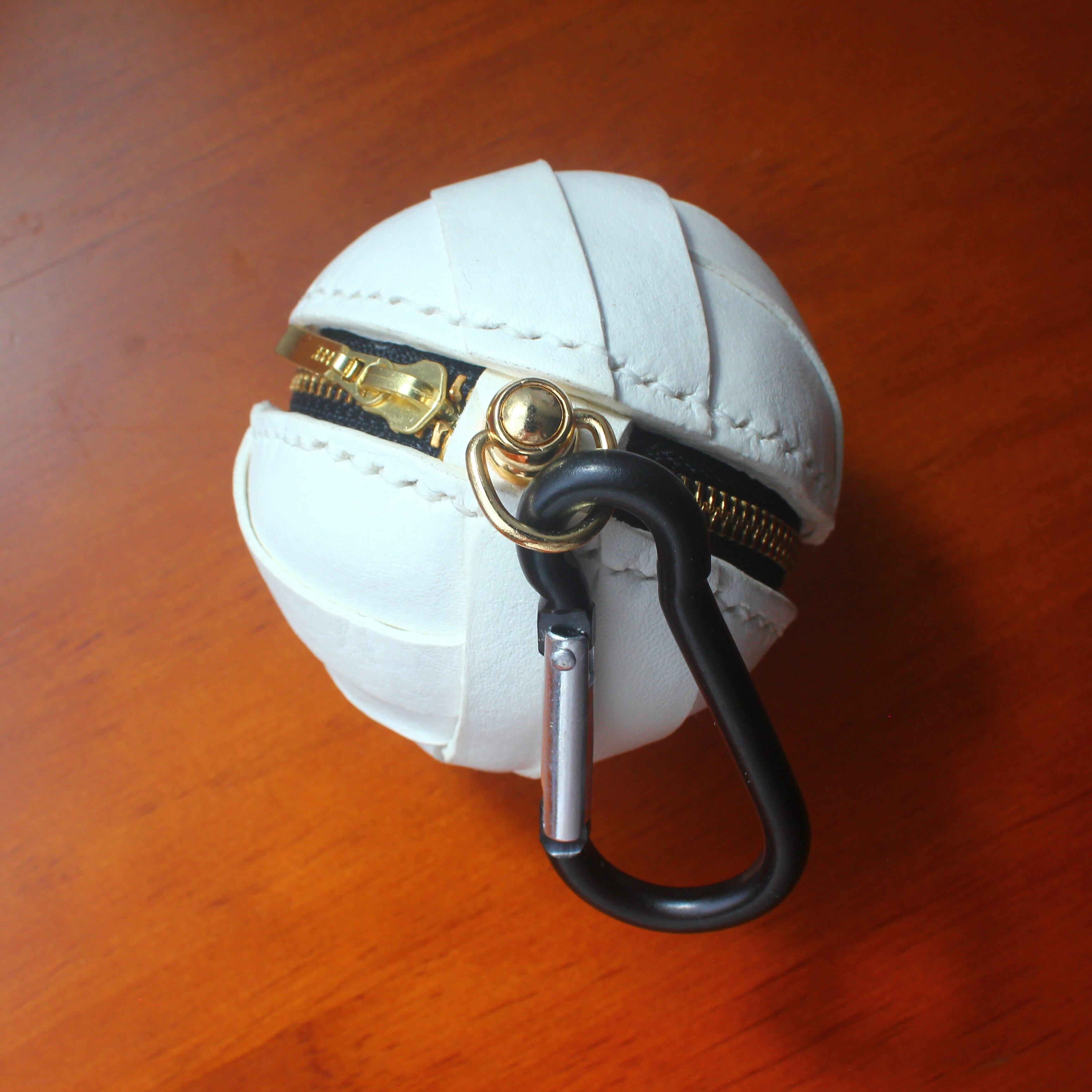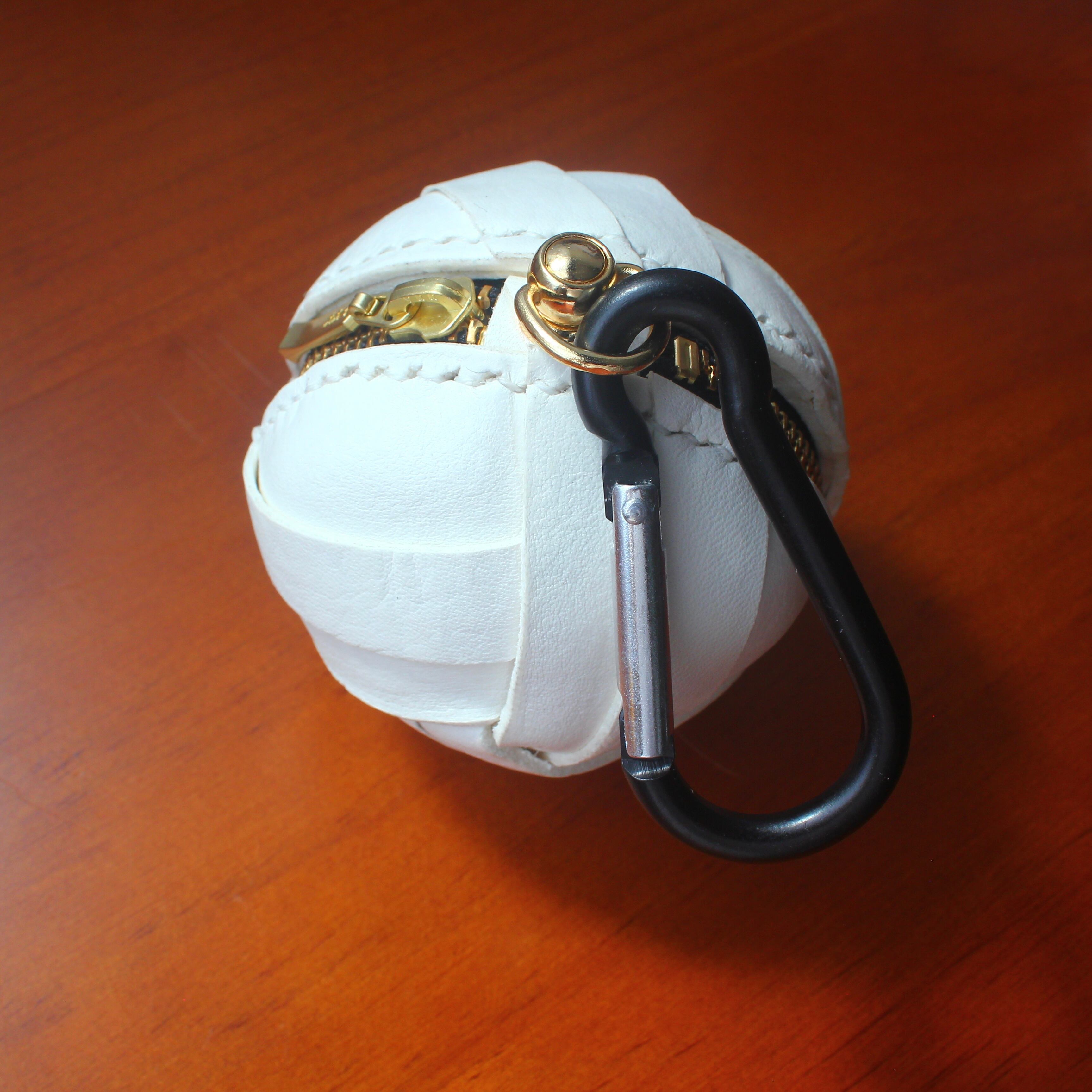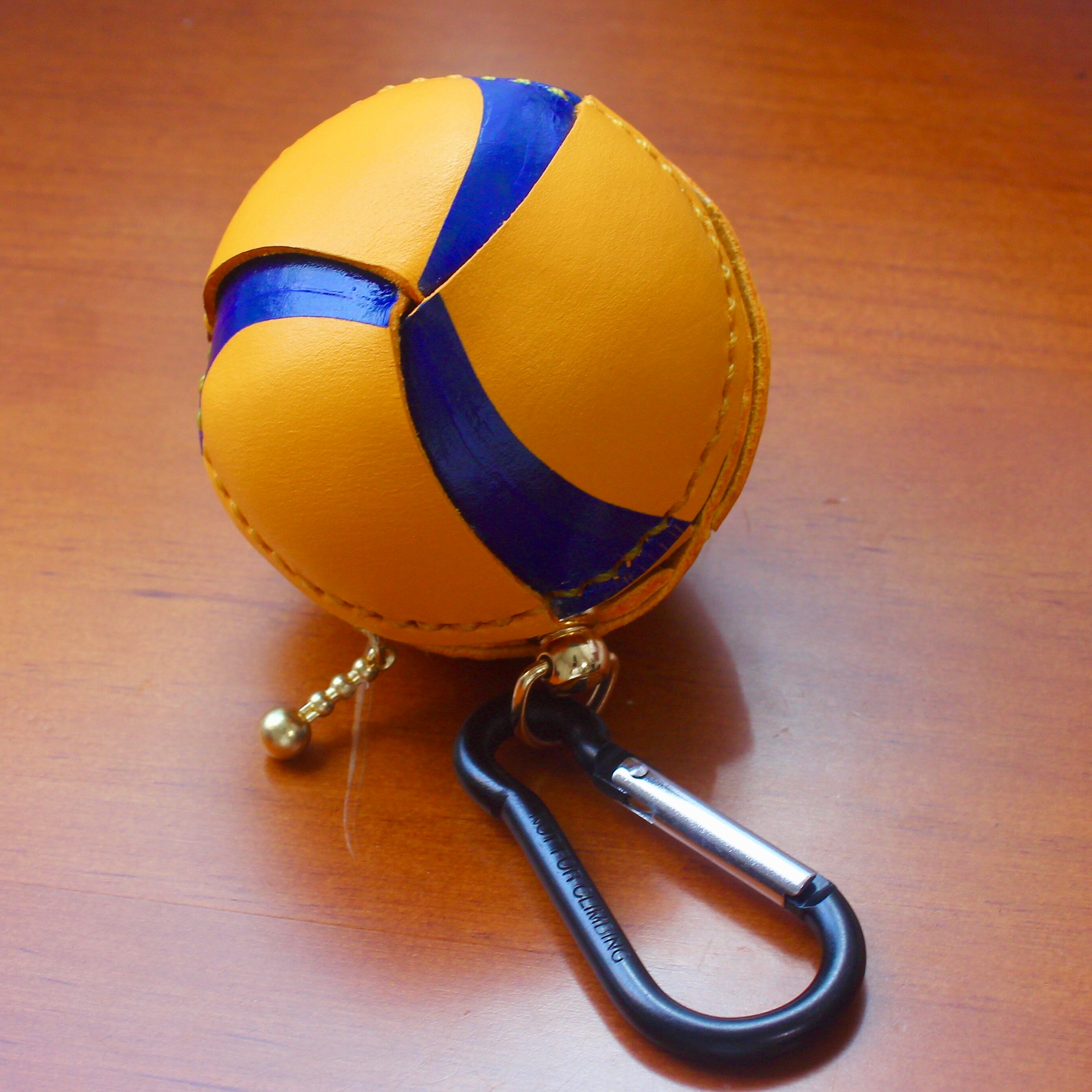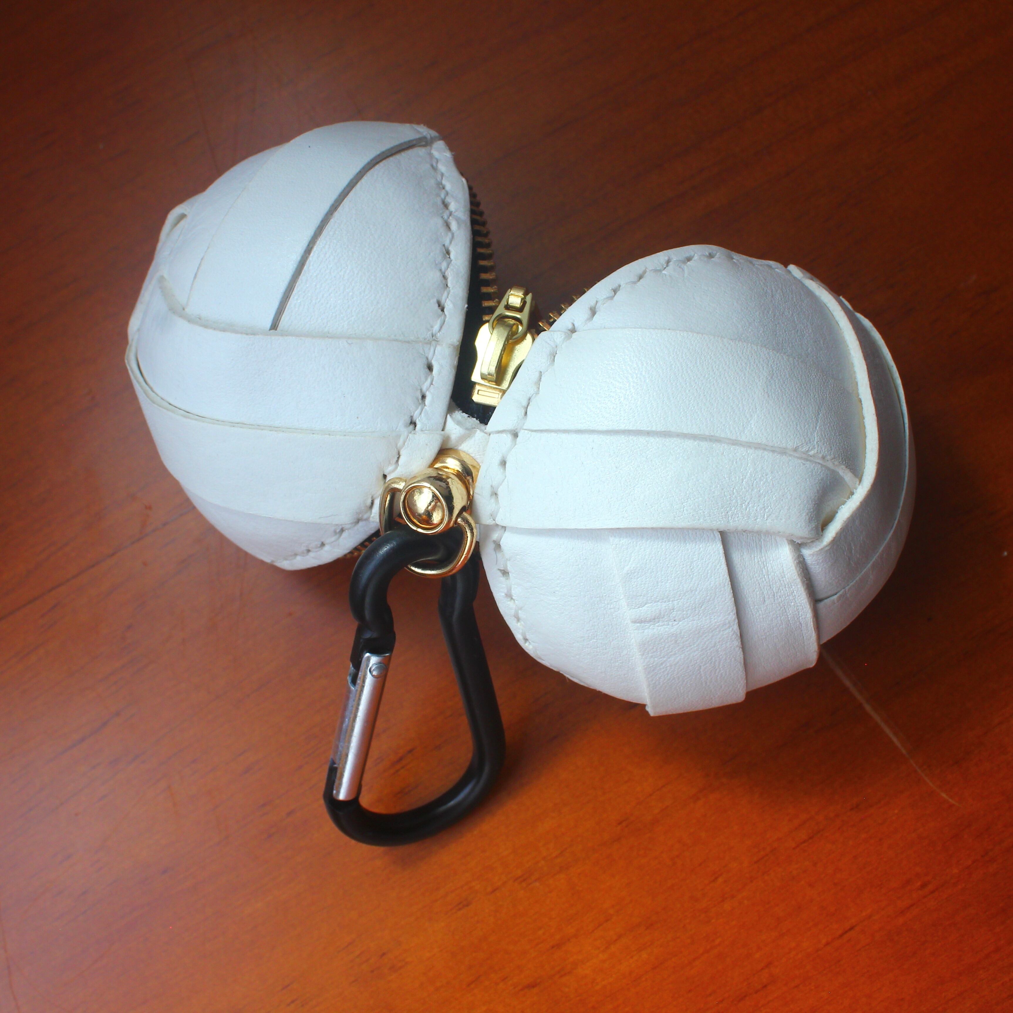 直径7cmの手のひらサイズで、ころんと可愛い立体フォルムがチャームポイントの、バレーボール型本革ポーチです。