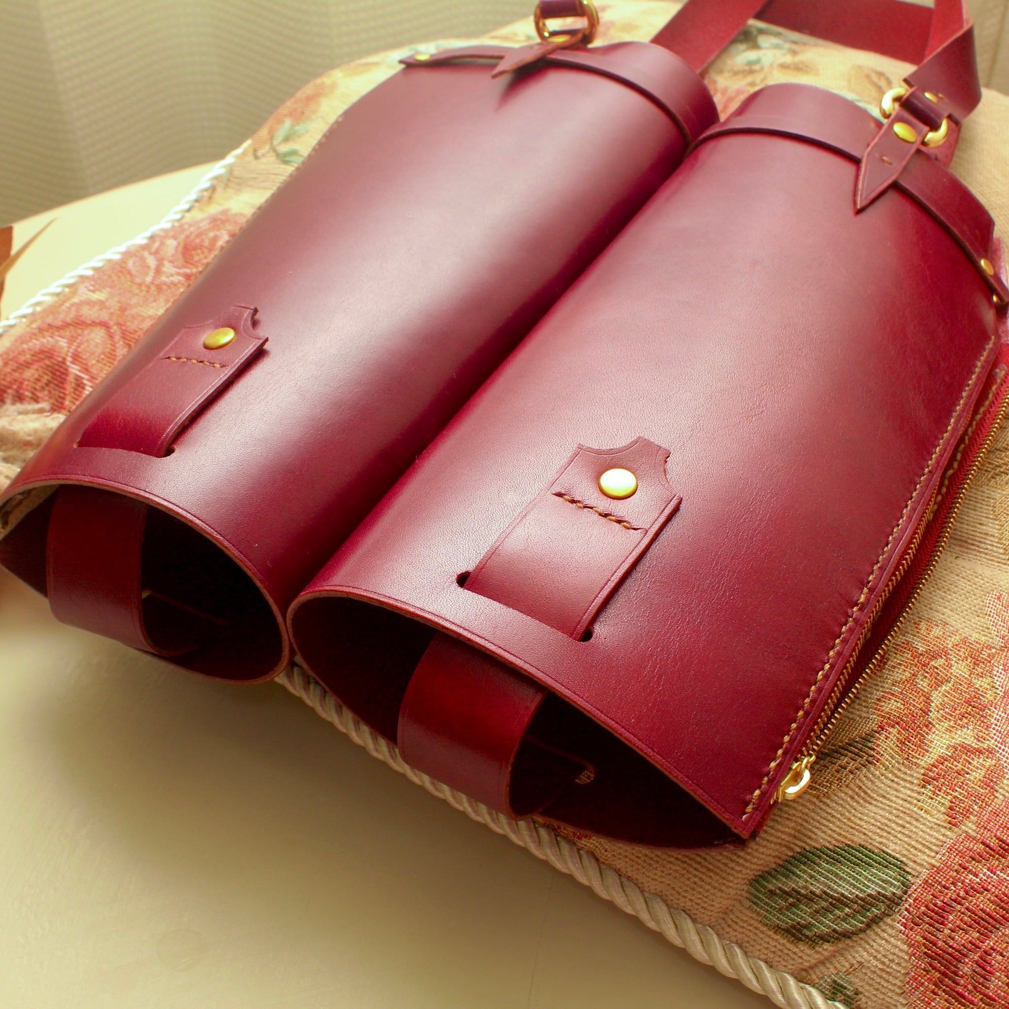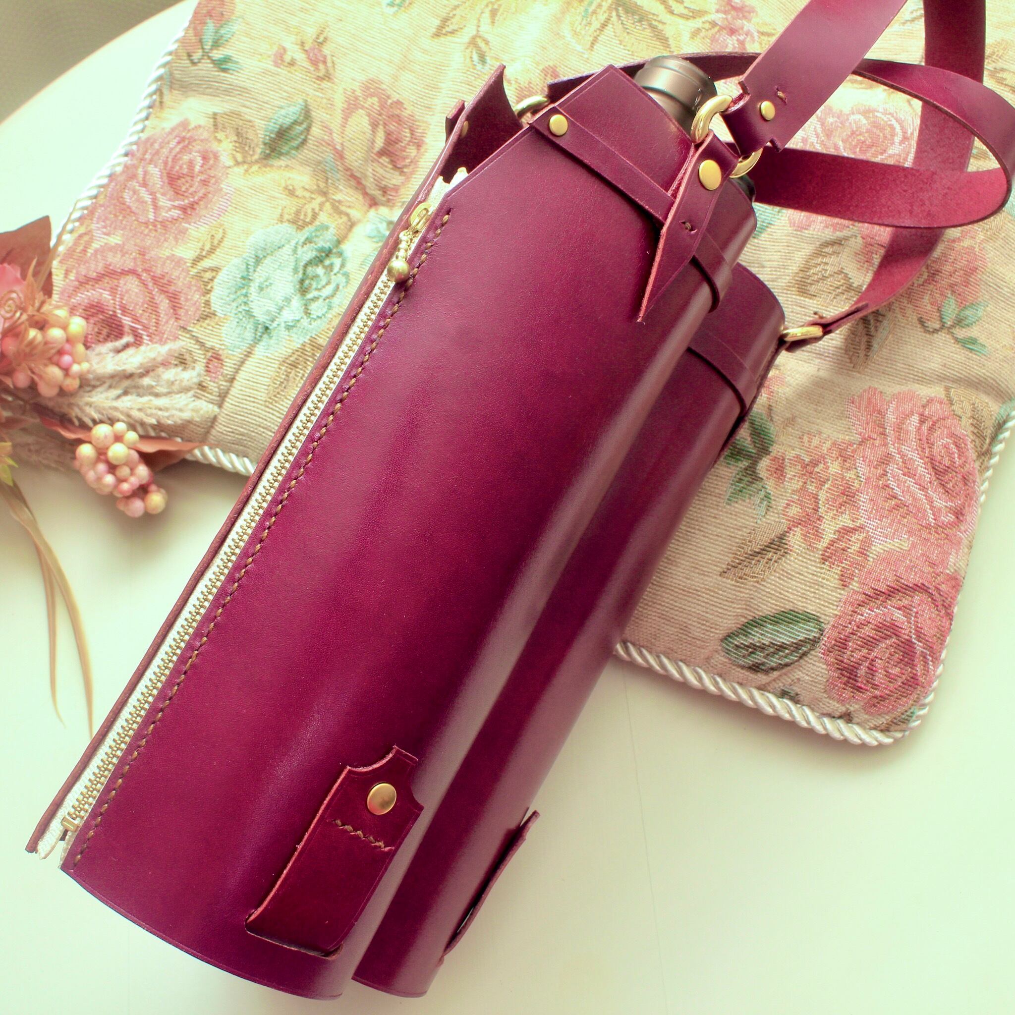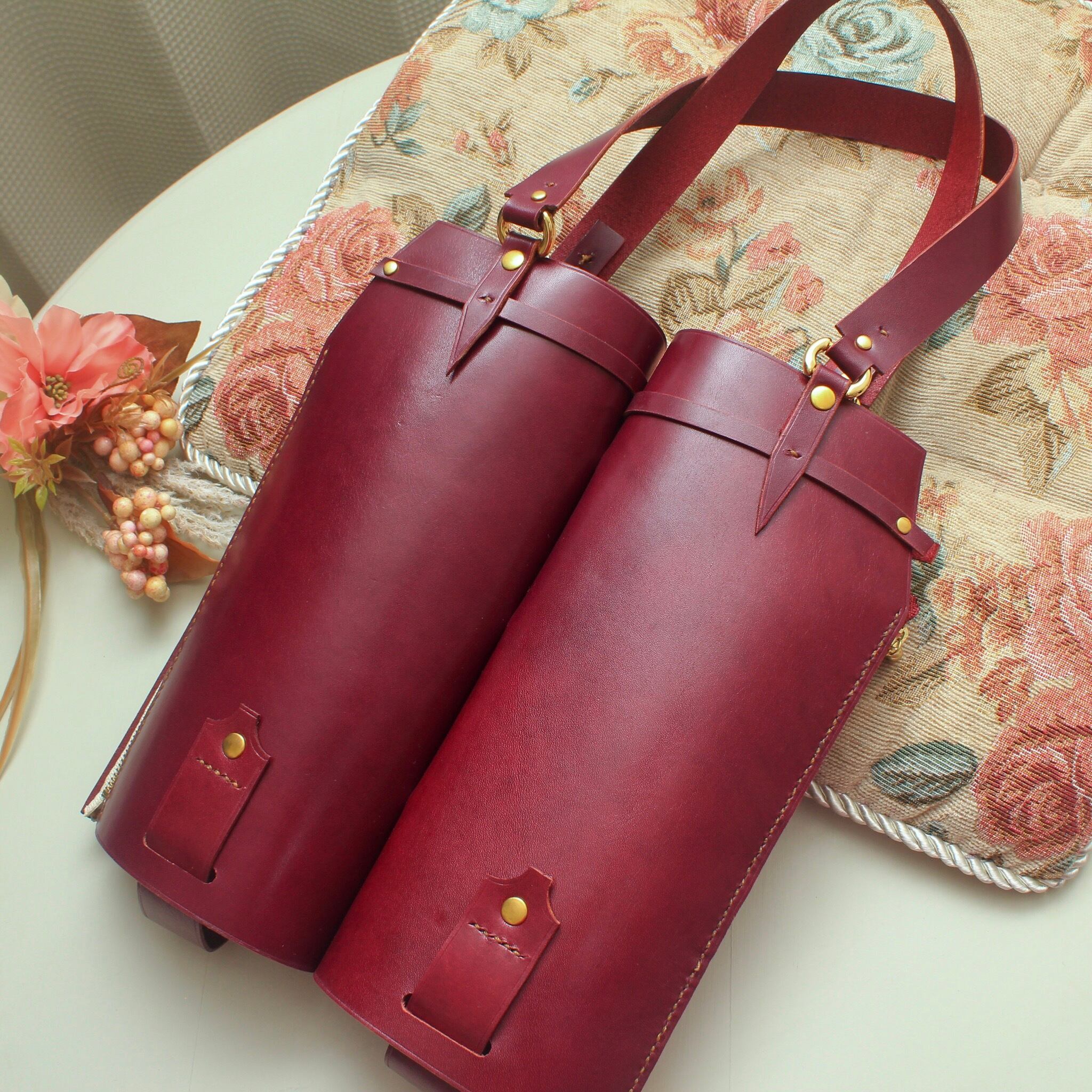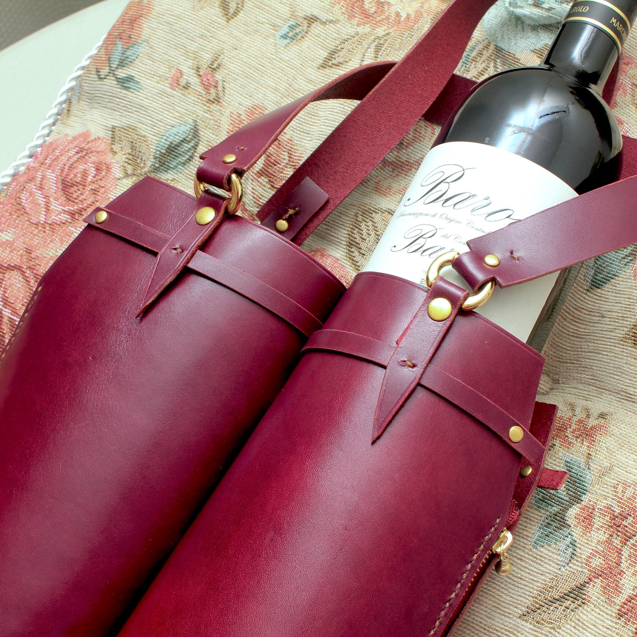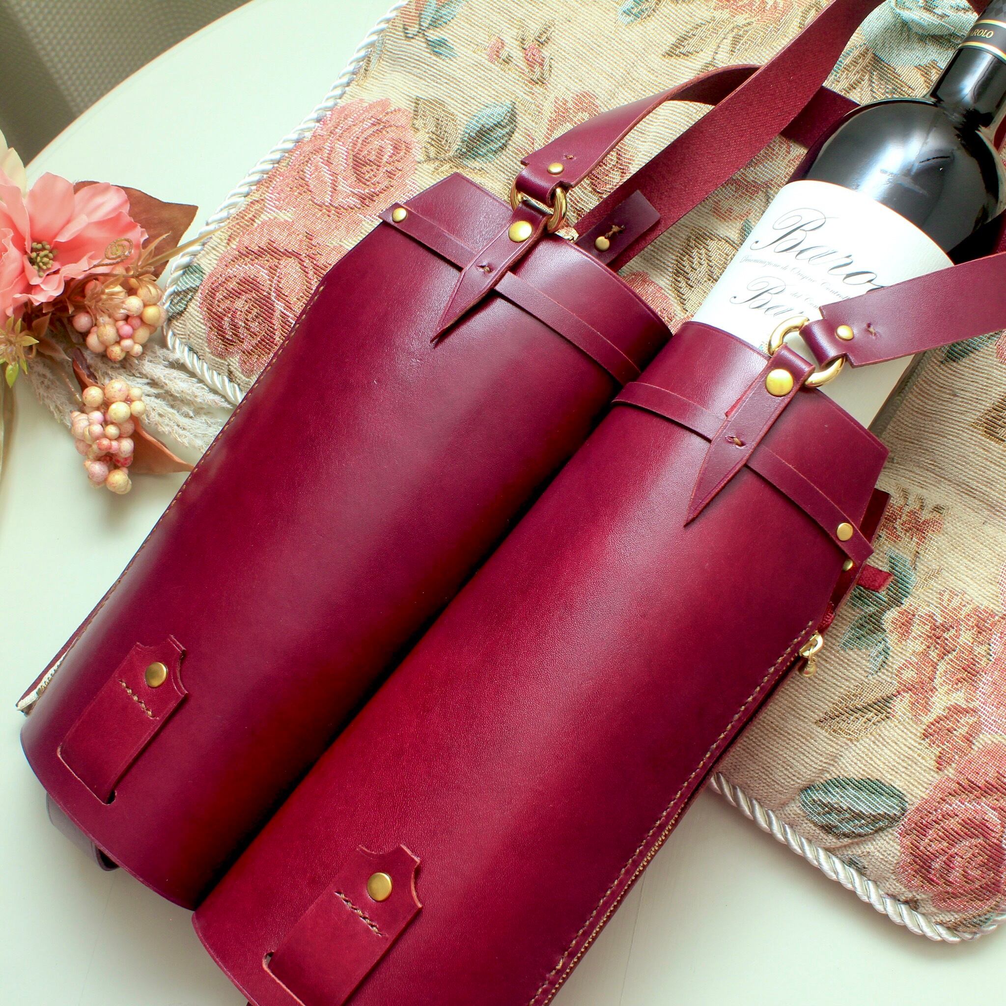 ツインタイプでワインレッドカラー(赤紫)の牛革を使用した高級感溢れるデザインです。本格的なワインを贈る際やパーティーなど、特別な場面での使用にぴったりです。