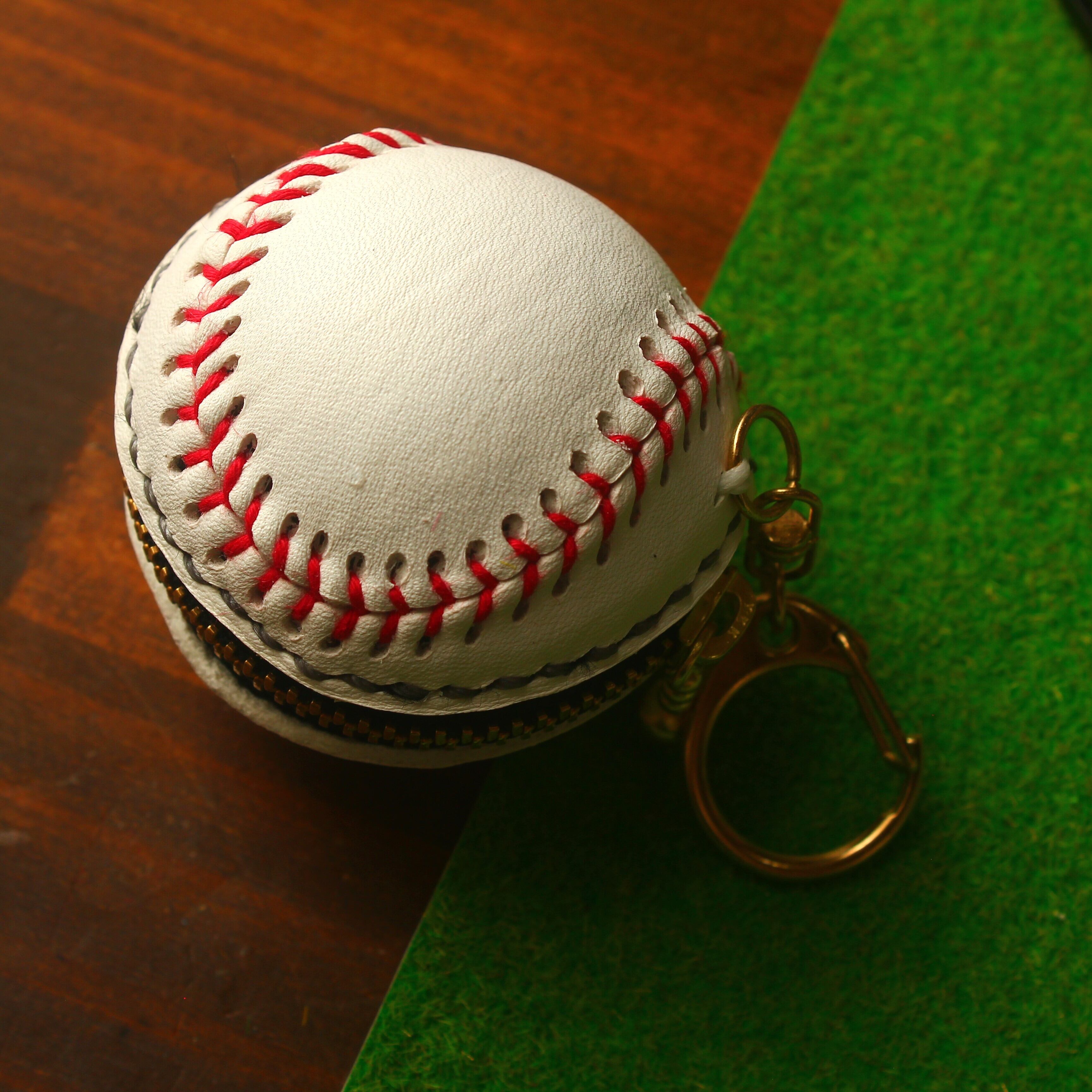 姫路産の本革を使い、野球ボールの形を忠実に再現した、立体感のあるミニポーチ(キーホルダー付き)です。
