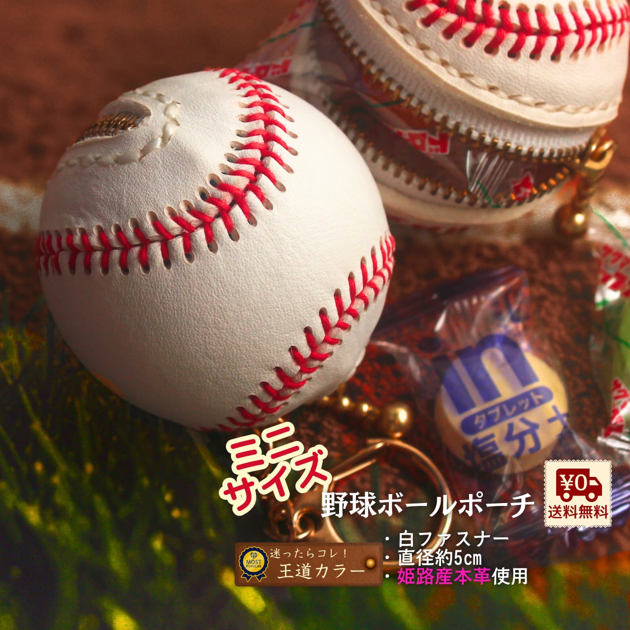 野球ボール 型 ポーチ ミニサイズ 直径約5cm【白ファスナー 】姫路レザー リアルな野球ボール の 小さなポーチ 鞄のアクセントや 野球好きさんへのプレゼントに!キーホルダー付き 送料無料 【刻印オプションあり】baseball | 革小物のオンラインショップ Leather Shop キュイール