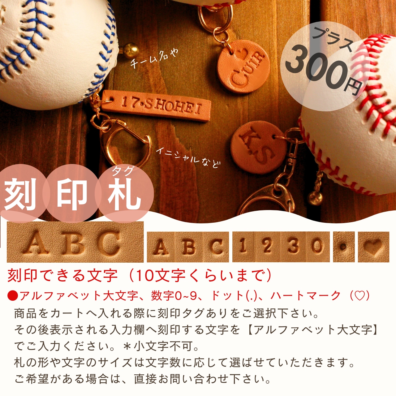 フルネーム・イニシャル・チーム名など、数字0〜9(小サイズ)、ドット(.)、ハート(♡)も刻印可能です。