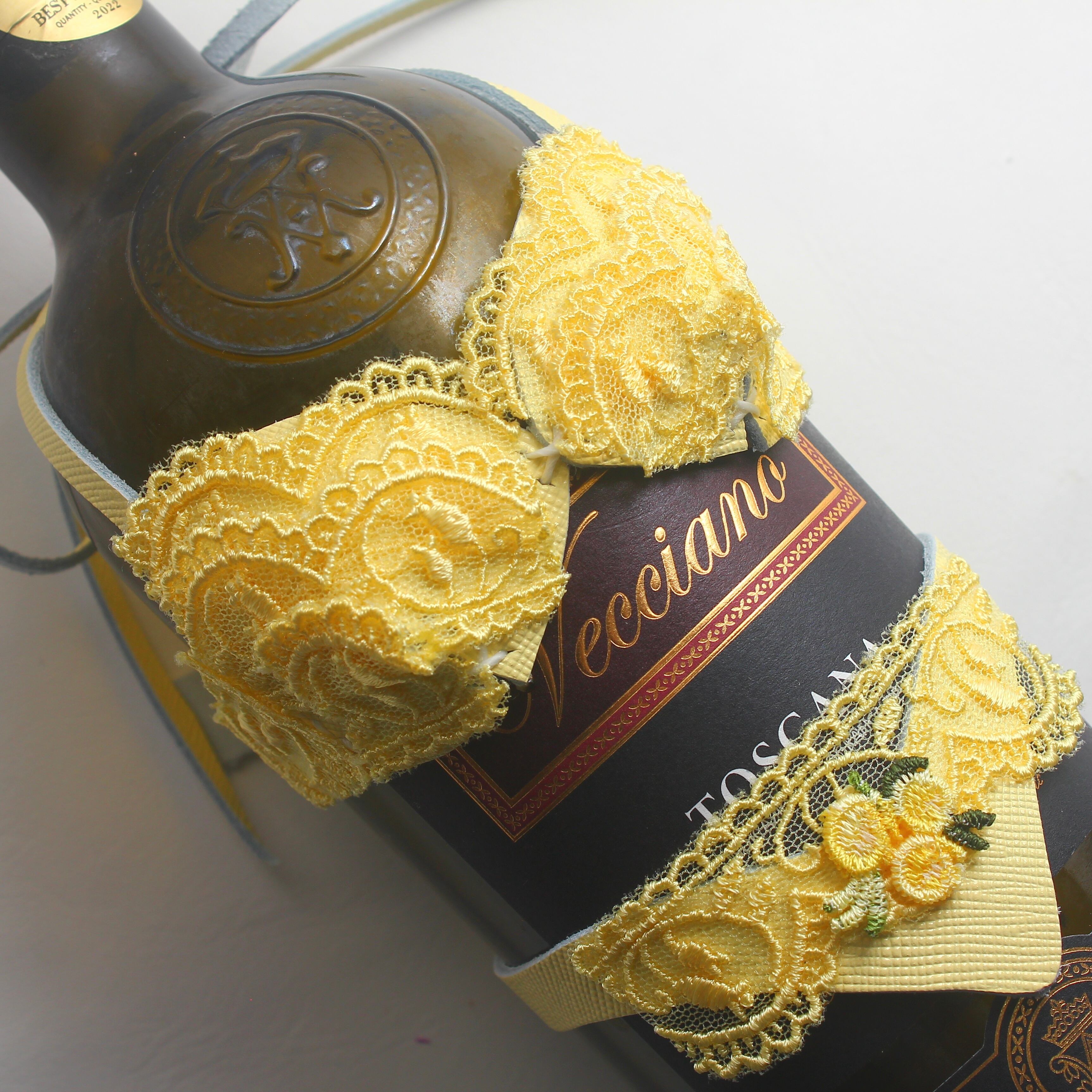 【ボトルに着せる下着】ボトルランジェリー 【ユニーク雑貨】ブラ&パンツ イエロー 総レース 上下セット ウイスキーやワインに着 せて 飲み屋さんのキープボトルにも! 本革使用 | 革小物のオンラインショップ Leather Shop キュイール